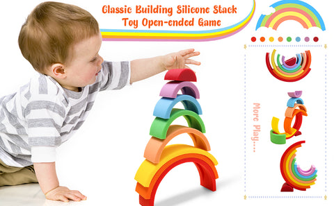 👶I blocchi impilabili in silicone ad arco colorati contraddistinguono i tradizionali blocchi e assi di legno presenti sul mercato. Molti giochi creativi sono previsti per i bambini. Può essere impilato per formare una forma piatta o tridimensionale. Come labirinti, ponti, tunnel, archi, ecc. Stimola molto bene l'immaginazione e la creatività dei bambini. È molto utile per il riconoscimento del colore e delle dimensioni e può anche migliorare le capacità di impilare e ordinare.